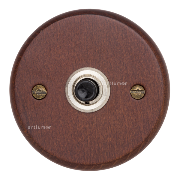 Pulsador de timbre con botón de color negro. Fabricado en madera de haya barnizada en color castaño oscuro.