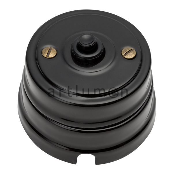Pulsador de timbre fabricado en porcelana negra con botón en color negro. Original diseño, evocando mecanismos antiguos. Ideales para entornos rústicos y clásicos.