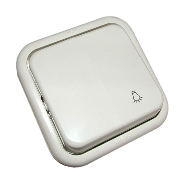 Pulsador de superficie para luz, de color blanco, con el símbolo de bombilla grabado en la tecla.