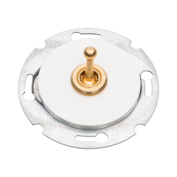 Pulsador de palanca fabricado en latón. Presionando la palanca el pulsador queda activado (por ejemplo, sonaría el timbre), al dejarla, retorna a su posición y se para. Embellecedor de madera lacada en color blanco que se integra a la perfección con nuestros marcos de porcelana.