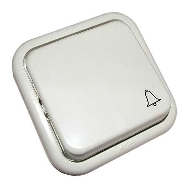 Pulsador de superficie para timbres, de color blanco, con el símbolo de campana grabado en la tecla.