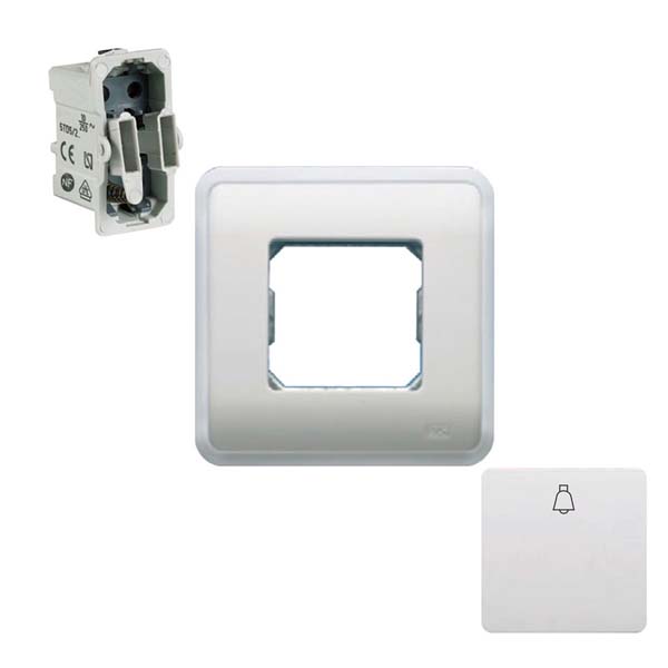 Pulsador completo (mecanismo, marco y tecla) para substituir, sin obra, utilizando el mismo cajetín antiguo, un pulsador de la serie BJC “Estrella”.