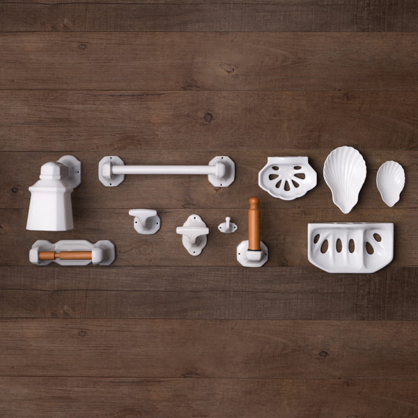 Repisa de cristal, de 40x11 cm. Con dos soportes de porcelana. Reproducciones auténticas de los años 20 al 50, fabricadas en porcelana con el mismo blanco natural que los originales. Son perfectos para aportar el acento rústico a cualquier baño.
