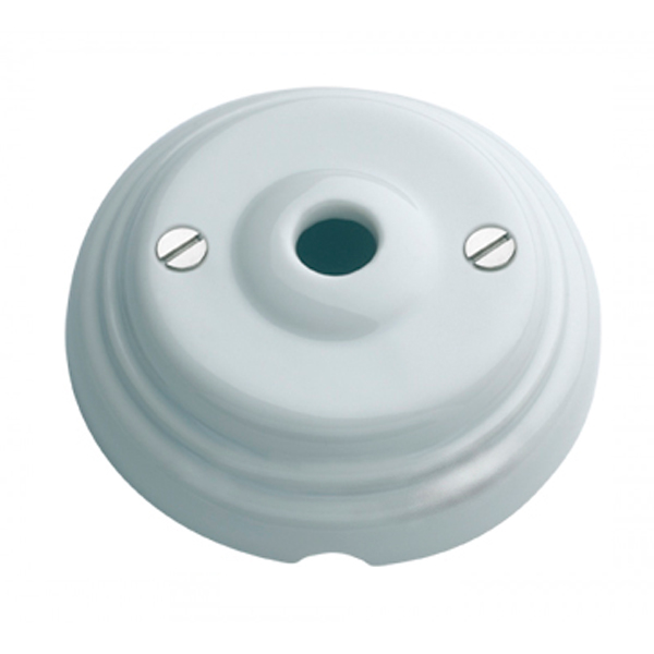 Es una roseta conexión de porcelana. Embellecedor para el techo con salida de cables. Cubre perfectamente la conexión eléctrica. Esta roseta resulta ideal para el montaje de lámparas en suspensión. Puede ser útil como florón de techo.