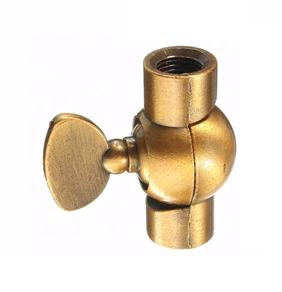 Rótula de metal en acabado bronce, con palomilla ajustable. Permite unir dos elementos de una lámpara como florones, portalámparas, tijas, etc. y poder articularlas. Con rosca hembra para fijarla al portalámparas o lámpara y poder orientar 180º. Hueca en su interior para el paso del cable eléctrico. Doble paso de rosca 10/100 (tipo universal para lámparas)