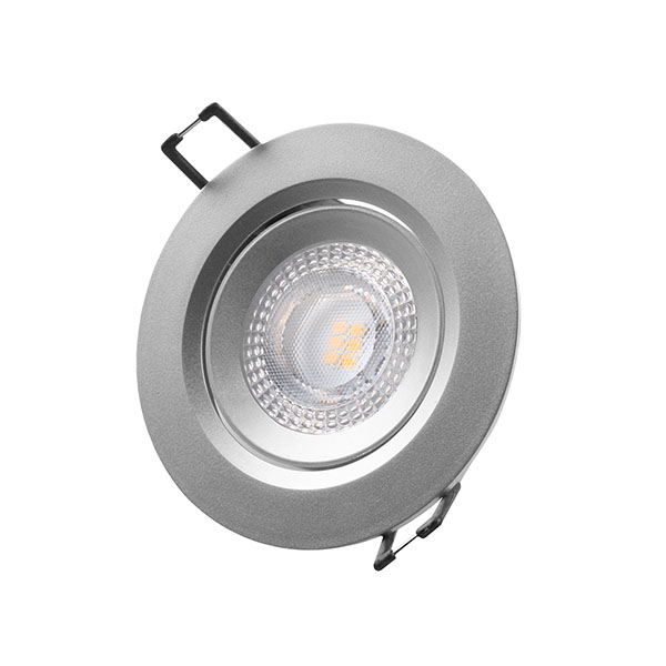Aro redondo en acabado aluminio mate para empotrar. Con luz LED de 5W, equivale a unos 40W (380 Lumens), de luz fría (6400ºk). Aro basculante para poder dirigir la luz.