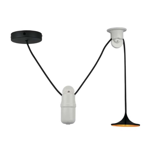 Sistema de contrapeso, fabricado en porcelana blanca para montar una lámpara “sube-baja”. Consta de dos accesorios, uno para fijar al techo, con rueda incorporada, a modo de polea y otro para hacer de contrapeso y poder graduar la altura de una lámpara, también incorpora rueda para el cable.
