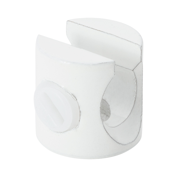 Pieza metálica de color blanco para fijar el cable a la pared o techo. Dispone de un orificio en su base para ser atornillado. Mediante su tornillo lateral regulamos la presión del prensacables. El tornillo lleva un aislador plástico en su interior para no dañar el cable.