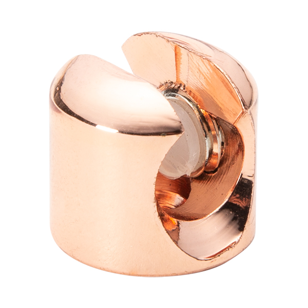 Pieza metálica en acabado cobre para fijar el cable a la pared o techo. Dispone de un orificio en su base para ser atornillado. Mediante su tornillo lateral regulamos la presión del prensacables. El tornillo lleva un aislador plástico en su interior para no dañar el cable.