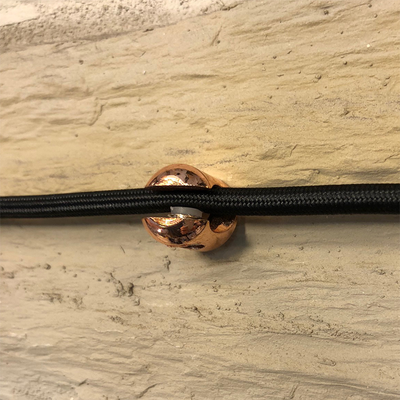 Pieza metálica en acabado cobre para fijar el cable a la pared o techo. Dispone de un orificio en su base para ser atornillado. Mediante su tornillo lateral regulamos la presión del prensacables. El tornillo lleva un aislador plástico en su interior para no dañar el cable.