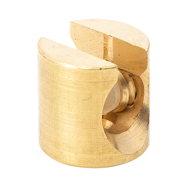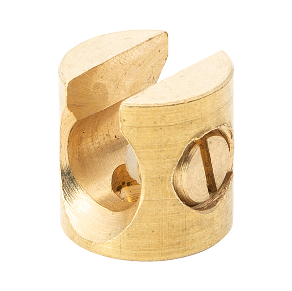 Pieza metálica en acabado latón para fijar el cable a la pared o techo. Dispone de un orificio en su base para ser atornillado. Mediante su tornillo lateral regulamos la presión del prensacables. El tornillo lleva un aislador plástico en su interior para no dañar el cable.