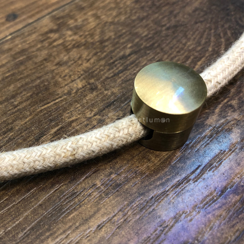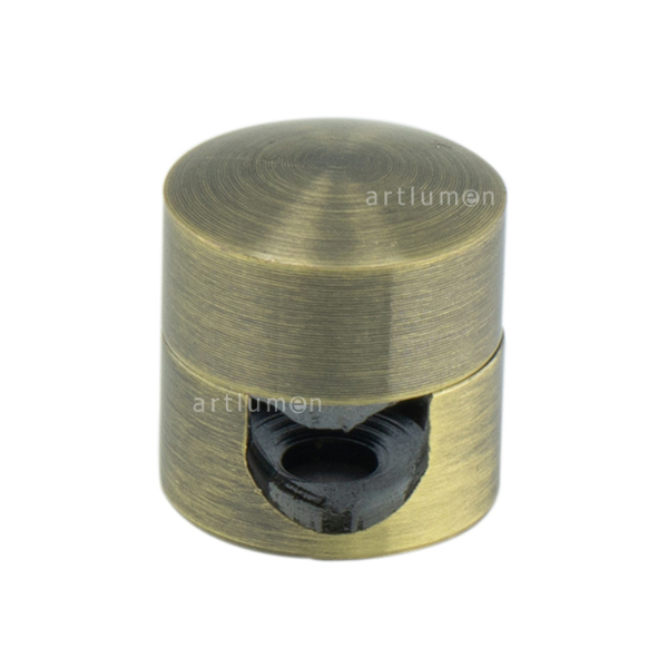Pieza de metal en acabado oro viejo para fijar el cable a la pared o techo. Una de las partes, la base, dispone de un orificio para ser atornillado a pared o techo. La otra parte, es la tapa que rosca y sujeta el cable eléctrico.