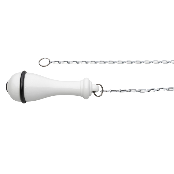 Tirador cisterna para WC de porcelana. Cadena metálica color plata. Reproducciones auténticas de los años 20 al 50, fabricadas en porcelana con el mismo blanco natural que los originales. Son perfectos para aportar el acento rústico a cualquier baño.