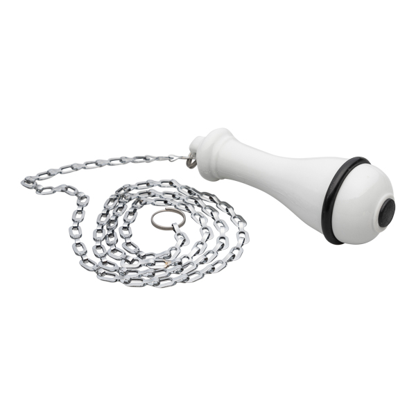 Tirador cisterna para WC de porcelana. Cadena metálica color plata. Reproducciones auténticas de los años 20 al 50, fabricadas en porcelana con el mismo blanco natural que los originales. Son perfectos para aportar el acento rústico a cualquier baño.