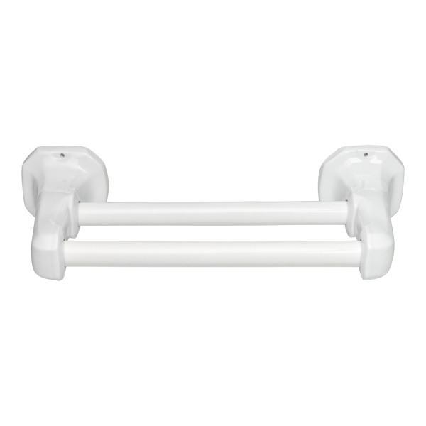 Toallero de porcelana con dos barras de porcelana, para dos toallas con espacio útil de 55cm. Soportes y barras de porcelana. Reproducciones auténticas de los años 20 al 50, fabricadas en porcelana con el mismo blanco natural que los originales. Son perfectos para aportar el acento rústico a cualquier baño.