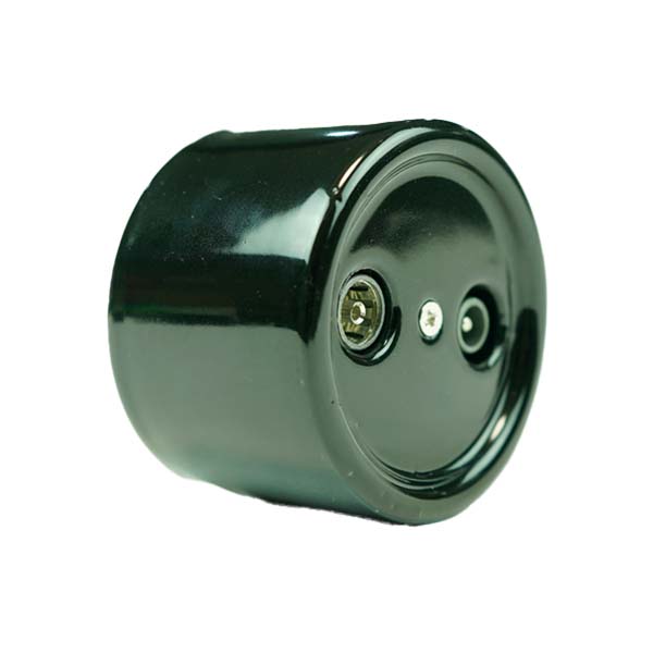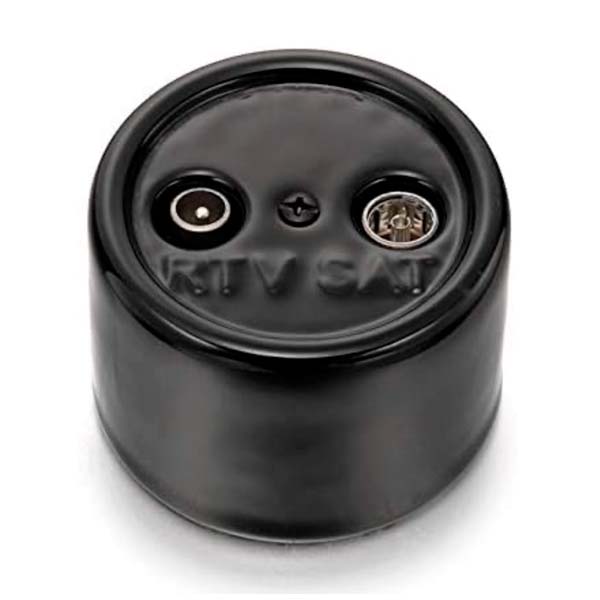 Toma de televisión fabricada en porcelana de color negro para su instalación en superficie.