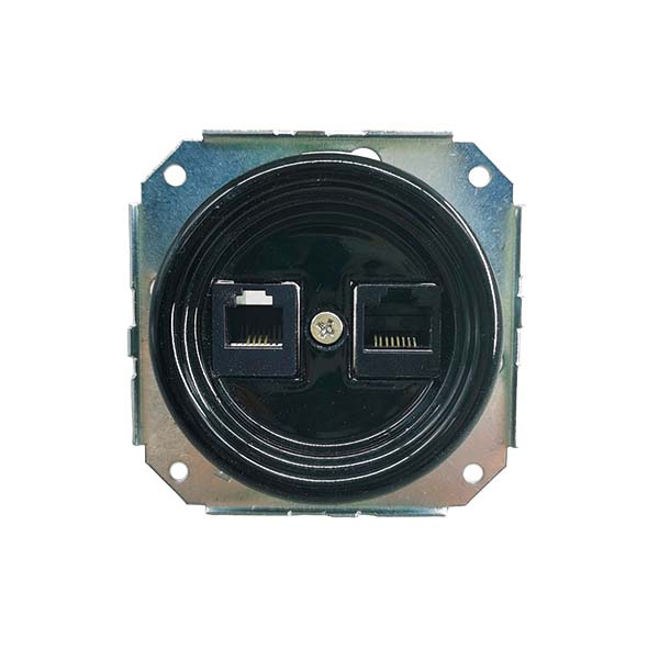 Toma de teléfono doble en porcelana negra, con un conector para toma de teléfono (RJ-11) y otro conector para toma de datos (RJ-45).