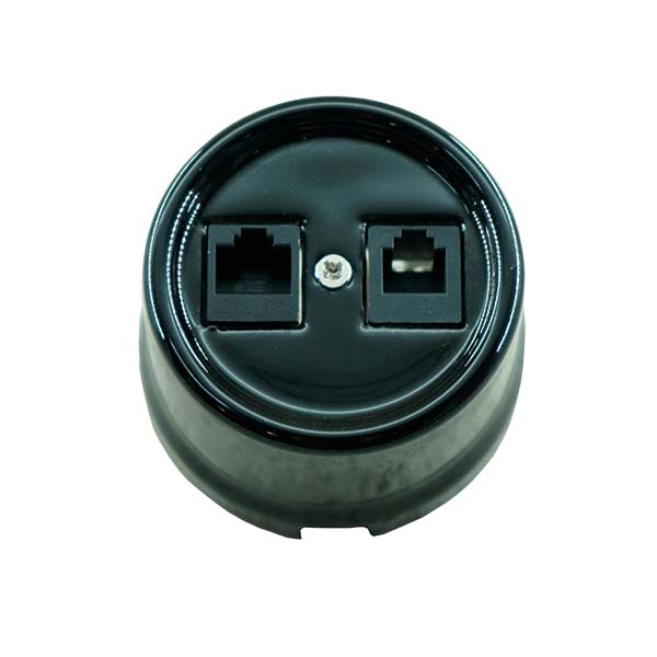 Base de superficie fabricada en porcelana color negro, con un conector para toma de teléfono (RJ-11) y otro conector para toma de datos (RJ-45).