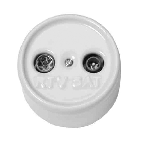 Toma de televisión fabricada en porcelana de color blanco para su instalación en superficie. Combina perfectamente con nuestros interruptores y enchufes de porcelana individuales. Su mecanismo acepta conectores de antena estándar. Dispone de dos entradas, una para Rádio/Televisión y otra para Televisión Satelite.