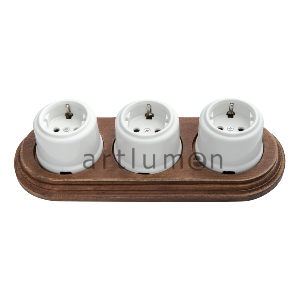 Conjunto de tres enchufes de porcelana montados sobre una base triple de madera natural de haya, envejecida a mano.