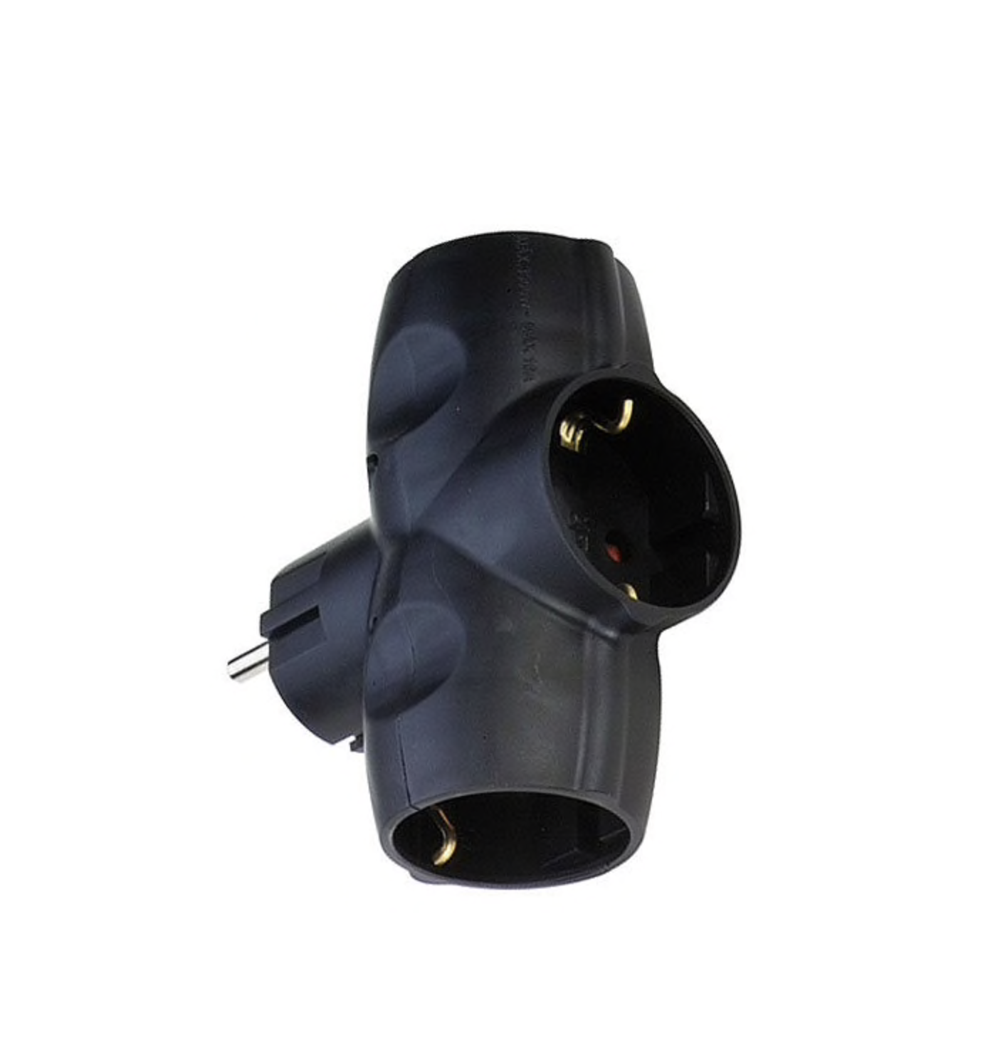 "Ladrón” con tres salidas. Adaptador triple para enchufar hasta tres aparatos (máximo 3500W). Clavija de espigas gruesas (d=4,8mm.)