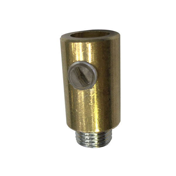 Pieza fabricada en latón usada como remate embellecedor de cables de gran diámetro, especialmente cables de cuerda o de yute. Tiene una entrada para el cable, con un espacio hueco de 9mm. El prensa-cables lateral de plástico es ajustable. En su otro extremo tiene una entrada con rosca hembra, de paso 10/100, para tubo roscado de ese paso (la pieza lleva uno incluido). Permite ser roscado a ganchos, argollas, florones de techo, portalámparas, etc.