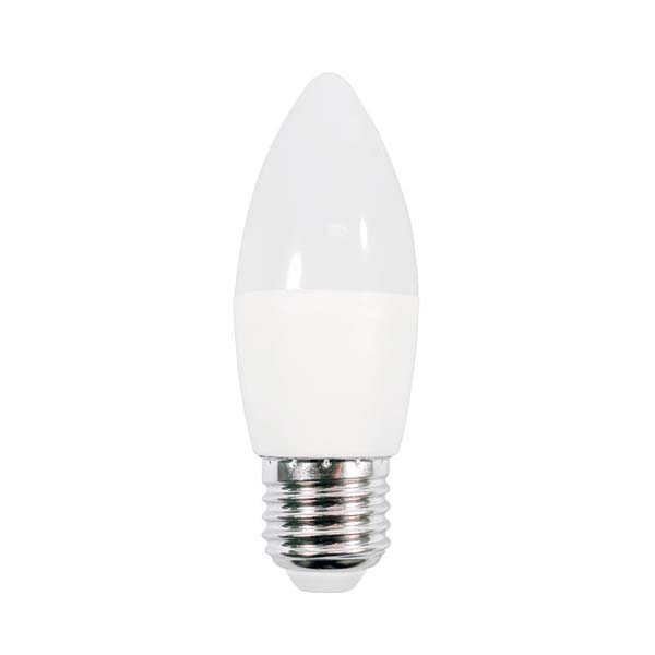 Bombilla LED en forma de vela. Tamaño muy compacto. Consumo de solo 6.5W, equivale a una bombilla tradicional de unos 50W (600 Lumens).